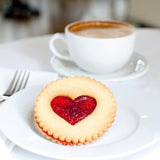 A smooth raspberry jam is sandwiched between two buttery and rich shortbread cookies.